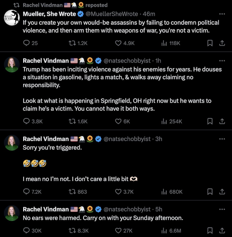 “Trump has been inciting violence against his enemies for years,” said Rachel Vindman on X. “Sorry you’re triggered. I mean no I’m not. I don’t care a little bit.”