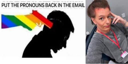 Danville Public Schools has placed a history teacher on administrative leave following a social media post depicting a rainbow-colored pistol pointed at a silhouette’s head with the caption, “PUT THE PRONOUNS BACK IN THE EMAIL.”
